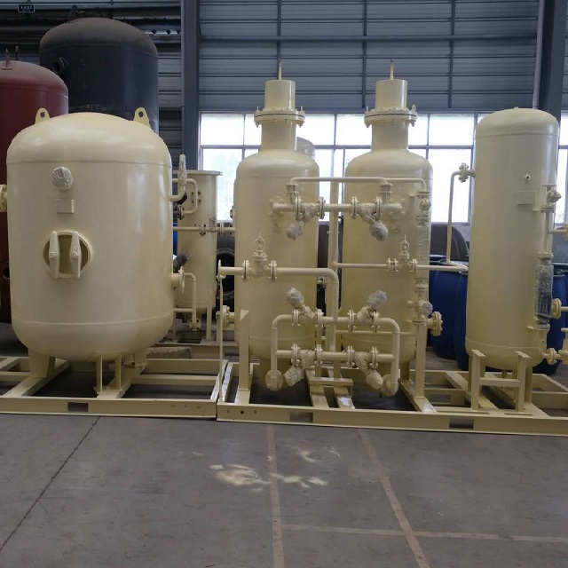 The pressure swing adsorption equipment mainly consists of two adsorption towers with carbon molecular sieves A and B and control systems equipped. When compressed air (typically 0.8 MPa) passes through the A column from bottom to top, oxygen, carbon dioxide and moisture are adsorbed by the carbon molecular sieve, while nitrogen is passed through and flows out of the top of the column. When the molecular sieve in the A column is saturated, it is switched to the B column to carry out the above adsorption process and simultaneously regenerate the A column molecular sieve. The regeneration, that is, the gas in the adsorption tower is vent to the atmosphere to rapidly reduce the pressure to atmospheric pressure, and then the oxygen, carbon dioxide and water adsorbed by the molecular sieve are released from the molecular sieve.
